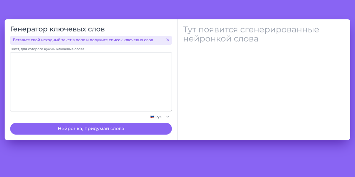 Форма «Генератор ключевых слов» состоит из одного поля, в которое вам необходимо вставить полный текст. Далее нажимаете кнопку «Нейронка, придумай слова», и искусственный интеллект после анализа текста выдаст вам список ключевых слов. Всё просто и быстро. Кроме того, ключевые слова можно получать на разных языках: сейчас доступны английский, французский, итальянский, белорусский и другие — просто выберете нужны флаг страны.