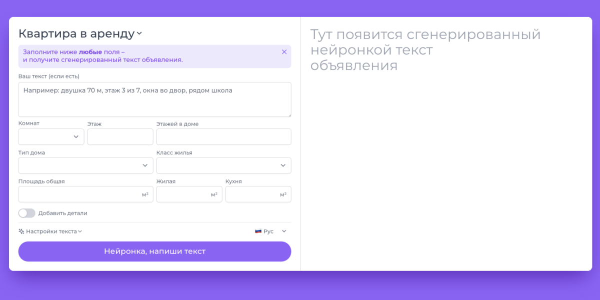 Такие параметры как количество знаков, тон общения, авторство позволяют сформировать подходящий текст для любой доски объявлений недвижимости.
