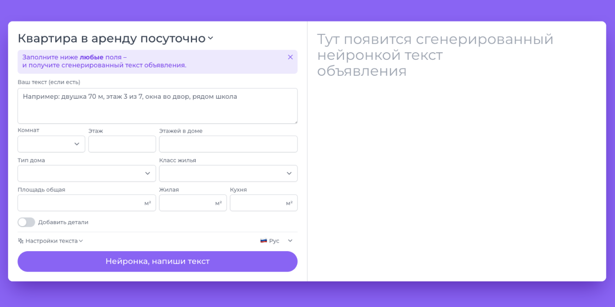 Такие параметры как количество знаков, тон общения, авторство позволяют сформировать подходящий текст для любой доски объявлений недвижимости.