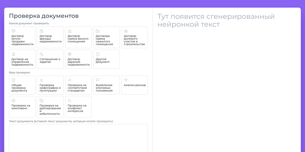 В блоке «Какой документ проверить» вы выбираете тип документа: договор это, соглашение или какой-то другой документ.