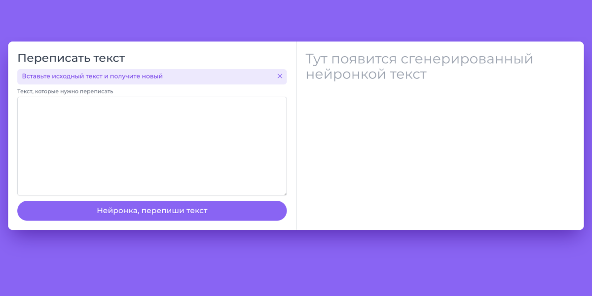 При работе с формой «Переписать текст» вам нужно в поле вставить исходный текст, а нейросеть перепишет текст другими словами.